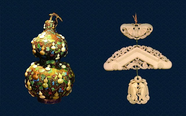 这件器物是乾隆时期的陈设品,表面覆满葫芦枝叶,镶嵌白玉、黄玉葫芦,以及五瓣红珊瑚珠制作的葫芦花若干,再以錾胎工艺表面去除多余部分,制成花叶、藤蔓、小葫芦,叶片内填以绿、黄、蓝、白等各色珐琅釉。