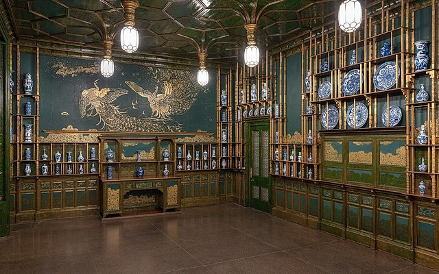 「孔雀厅」是美国印象派画家 James Whistler 最著名的室内装潢作品,被认为是19世纪末盎格鲁-日本风格(Anglo-Japanese style)的经典之作。整个房间以蓝绿色和金色为主色调,使用大量金箔,从天花板、墙壁、地板,到展架、桌子、百叶窗,处处充满唯美主义的装饰设计,与陈列的各类瓷器共同营造华丽而和谐的美学效果。