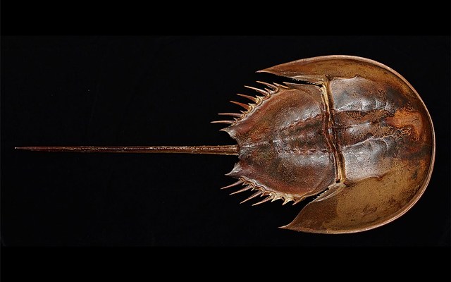 马蹄蟹身体的主要组成部分:头胸部、腹部和剑尾。