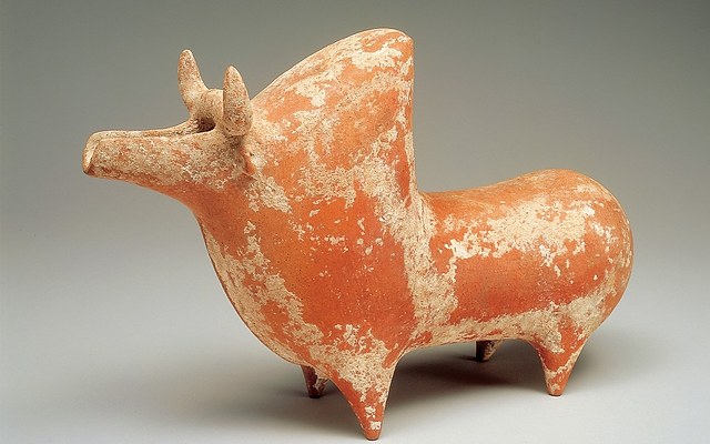 瘤牛在古代的西亚、印度、非洲等地区被作为家畜来饲养,以公牛崇拜为核心的宗教发源于西亚。这件牛形陶器四肢粗短、背部有突出的肉瘤,脸部为注水口,可注入葡萄酒等。