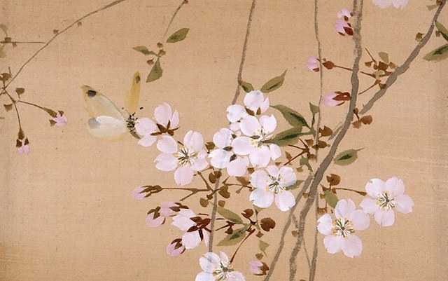 樱花自古出现在日本文学艺术中,对近现代的日本画而言也是重要的题材。一些取材于历史与文学的作品中,樱花作为让人印象深刻的元素登场,如小林古径(Kokei Kobayashi)的《清姫》「入相樱」、效仿江户时代风俗画的上村松园(Uemura Shoen)《樱可里》,在古代题材中有效运用了樱花的形象。