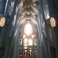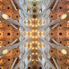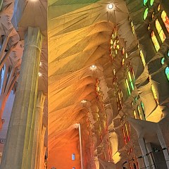 圣家堂是一座拉丁十字式天主教堂,内部设有中殿(Nave)、侧殿(Transept)、后殿(Apse)和地下圣堂(Crypt),建筑运用了大量几何设计元素,例如拱顶与列柱之间的双曲面和抛物面、螺旋状楼梯、椭球形柱头、圆锥曲面屋顶等。