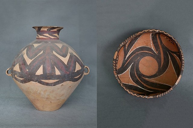 旋涡纹黑白彩内外彩单耳彩陶盆,马家窑文化-马家窑类型