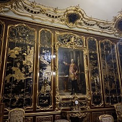 Maria Theresia 书房为典型的中国式装饰风格,艺术特点在于模仿瓷器质感的蓝白色浮雕以及213幅蓝白水粉画。Franz Stephan 书房则装饰着产自中国的漆木板,呈现从洛可可到古典主义的过渡艺术风格。