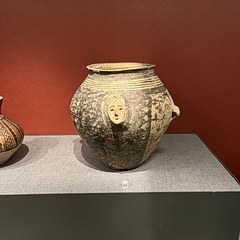 二层「文明起源」展区聚焦中国石器时代,陈列兴隆洼、庙底沟、陶寺等遗址出土文物。这一展区最值得关注的文物之一是出土于安徽亳州蒙城尉迟寺遗址的一件新石器时代大口陶尊,其口沿下方刻有类似「日」「月」「山」形状的符号,史学界认为这些符号和汉字起源有着关联。