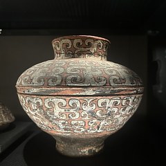 中国考古博物馆展厅,上方为文物墙,下方为殷墟车马坑二层「文明起源」展区聚焦中国石器时代,陈列兴隆洼、庙底沟、陶寺等遗址出土文物。这一展区最值得关注的文物之一是出土于安徽亳州蒙城尉迟寺遗址的一件新石器时代大口陶尊,其口沿下方刻有类似「日」「月」「山」形状的符号,史学界认为这些符号和汉字起源有着关联。