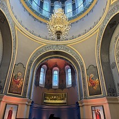 教堂平面呈拉丁十字布局,南北宽28米,东西长42米。十字中轴线上为主礼拜厅,东端为主祭台,南北两翼各设一个小礼拜厅,二层设有唱诗台。教堂内的壁画由俄国艺术家 Anastasiev 绘制。
