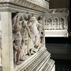 「亚历山大石棺」制作于公元前4世纪晚期,外部雕刻了亚历山大大帝率领马其顿军东征的「伊苏斯战役」,雕刻技艺精良,展现了古代墓葬艺术。