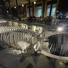 一层以海洋生物为主题,悬挂着巨大的蓝鲸和南露脊鲸骨架标本;二层陈列非洲草原、撒哈拉沙漠、南美洲雨林与极地地区的陆地动物标本,包括大象、长颈鹿、犰狳、瞪羚、耳廓狐、北极熊等。