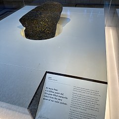 蓝色区共有7个展厅,主要展出恐龙、哺乳动物、海洋无脊椎动物、鱼类、两栖类和爬行动物标本,展现了地球生物的多样性。重要展品包括霸王龙骨架化石、澳大利亚最大的哺乳动物双门齿兽化石、世界上发现的第一块禽龙牙齿化石(右图)等。 红色区共有6个展厅,主题分别为地球宝库、早期地球、人类演化、化石标本、气候变化、火山与地震,揭示了地球诞生与生命演化46亿年的历程。其中化石标本展厅主要展出岩石、植物和矿物标本,大部分标本允许参观者触摸。