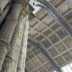 1880年,大英博物馆将自然历史类藏品转移至位于南肯辛顿的新馆,这座展馆由英国建筑师 Alfred Waterhouse 设计,呈现罗曼式建筑风格,门廊立柱雕刻植物纹饰,西翼和东翼墙砖分别饰有现存物种和灭绝物种的浮雕图案。