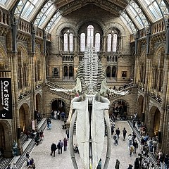 伦敦自然历史博物馆(Natural History Museum)1881年向公众开放,是英国规模最大的自然历史博物馆,收藏超过8000万件动植物标本、矿物及化石。重要藏品包括长达25米的蓝鲸骨骼标本、第一批人类发现的禽龙牙齿化石等。