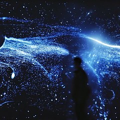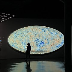 「宇宙」展区位于2楼,分为「时空」、「引力」、「光」、「元素」、「生命」5部分,从不同视角展现宇宙的运行规律。展区中的「假如剧场」由多层异型幕组建,生动演绎宇宙起源的故事;参观者还可以在「奇异时空」展项中与26岁的爱因斯坦合影。
