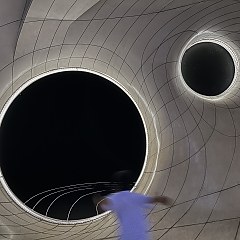 天文馆主建筑以优美的螺旋形态构成「天体运行轨道」,圆洞天窗、倒转穹顶和球幕影院这3个圆形元素构成「三体」结构,以此象征天体运行的基本规律。室外绿化勾勒出星系的旋臂形态,与「星空之境」公园自然衔接,充分体现了建筑与生态的有机融合。