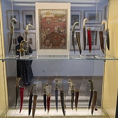 大马士革室印度、中国和马来展厅则分别展示了从这些国家收集的伊斯兰主题藏品,例如印度镶钻珐琅金项链、以阿拉伯语作为纹饰的毛笔缸、19世纪金顶银身槟榔盒、一把印度尼西亚「克里斯」匕首等。