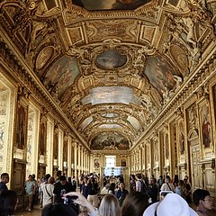 绘画部:共有139个展厅和1.2万件藏品。达芬奇《蒙娜丽莎》位于卢浮宫内最大的展厅「议政厅」,正对面的墙上悬挂着馆内尺幅最大的绘画作品《加纳的婚礼》。