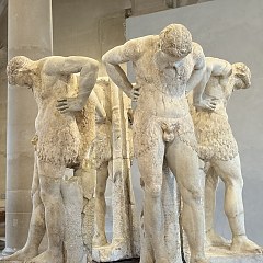 卢浮宫建筑群分为黎塞留馆、叙利馆和德农馆3个部分,室外区域包括杜乐丽花园和多处庭院,建筑面积达38万平方米。藏品总计61万6920件,常年展出约3.5万件,分属以下8个收藏部门:古希腊、伊特鲁里亚及古罗马文物部:共有54个展厅和8.2万件藏品,文物以古希腊雕塑和陶器居多,年代从新石器时期至公元6世纪。最不容错过的藏品是位于古董长廊尽头的「米洛的维纳斯」雕塑及达鲁阶梯顶层的「萨莫色雷斯岛的胜利女神」雕塑。