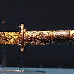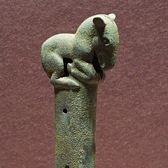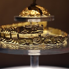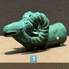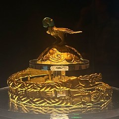 馆内最重要的藏品是一件战国时代的匈奴王金冠,这件文物又名鹰顶金冠饰,冠带浮雕虎、狼、羊、马四种动物图案,顶部装饰黄金及绿松石制成的雄鹰,代表了战国时期北方民族贵金属工艺的最高水平。