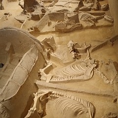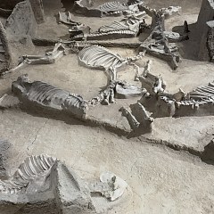 车马坑中最引人注目的是「天子驾六」考古遗存的原状陈列,即由六匹马并列拉一辆马车,车辕、车身构件及马的骨骼清晰可见,再现天子出巡仪仗队列的场面,印证了古文献中关于「天子驾六」的记载,为研究东周时期的乘舆制度和丧葬制度提供了重要考古资料。