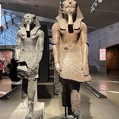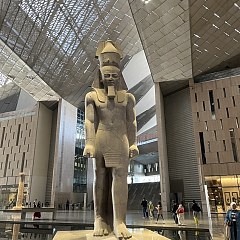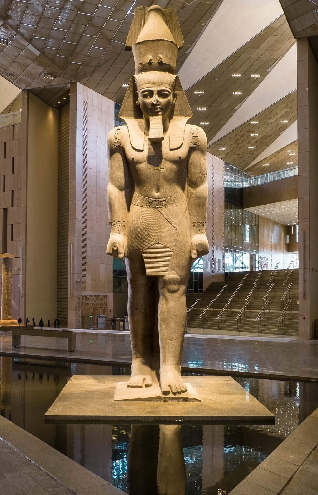 这座法老拉美西斯二世雕像1820年发现于孟菲斯遗址区,1955年起陈列在开罗拉美西斯火车站旁的广场,2018年被迁至大埃及博物馆入口大厅永久展出。每年拉美西斯二世的生日(2月21日)与登基日(10月21日),阳光将精准穿透大厅入口处的墙面孔洞,照亮拉美西斯二世雕像的面部,致敬阿布辛贝神庙的「太阳节奇观」。