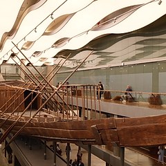 这是一个位于室外的独立展馆,核心展品是古埃及第四王朝法老胡夫的大型陪葬品「胡夫船」(Khufu ship),年代可追溯至约公元前2500年。整艘船由1224块黎巴嫩雪松木制成,长约42米、重约20吨,是迄今发现的最古老、规模最大的船只之一。