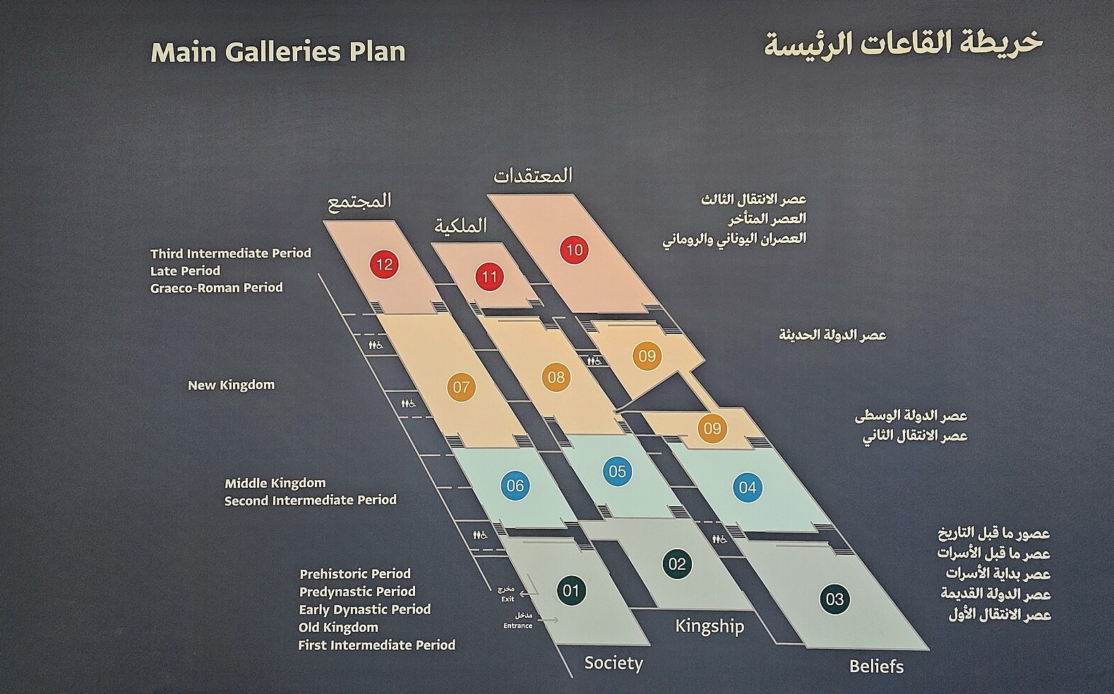 主展厅位于大阶梯的左侧,按时间年代以及「王权」「社会」「信仰」3大主题分成12个展厅,总面积1.8万平方米,共陈列逾2.4万件文物,完整呈现埃及从史前时期到公元400年希腊罗马时代的文明发展史。