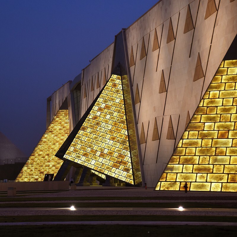 大埃及博物馆位于尼罗河河谷平原和吉萨高原的交界处,毗邻吉萨金字塔区,总占地面积达50万平方米。整座建筑物采用三角形平面布局和放射状的视觉轴线设计,借助地形的高低落差创造具有层次感的空间,外墙以象征金字塔的三角形为设计主体元素,大理石、玻璃窗和透明雪花石膏构成的外墙使得自然光线可以透入内部。