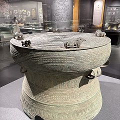 这是我国迄今为止发现的最大的铜鼓,鼓身高67.5厘米,鼓面直径165厘米,重达300千克「五彩八桂:广西民族文化陈列展」通过1800件展品介绍广西12个世居民族的传统文化。展览分为四个部分,第一部分「家园」从广西自然地理条件出发,介绍少数民族的建筑及生产生活方式,另外三部分则介绍民族传统纺织服饰、民间工艺和民俗文化。